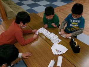 ペーパータワーは、A4用紙を使って、チームで協力しながら高いタワーを作ります。コミュニケーション能力、役割分担を実践的に養うことができます。子ども達も、どうやって組み立てていくかを話し合いながら、お互いの意見を聞きながら取り組む姿がありました。