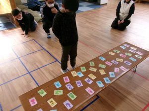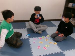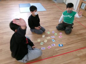 子ども達もヒントを聞き逃さないように集中して聞くことができ、特徴にあったモンスターを見つける為に、よく目を凝らして取り組んでいました。又、今回のかるたは、スリーヒントクイズになるので、ワーキングメモリーの要素もあり、聞いて記憶することにも繋がっています。