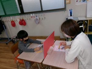 子どもたちはそれぞれ違うイラストを1枚ずつ持ち、相手に見えないように口頭でイラストの特徴を伝え合います。