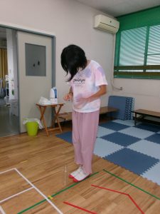 次に寝そべった状態で転がってくるボールを打ち返してペットボトルに当てる活動をしました。