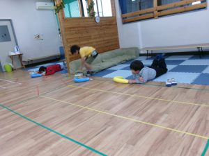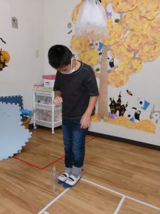 次に寝そべった状態で転がってくるボールを打ち返してペットボトルに当てる活動をしました。