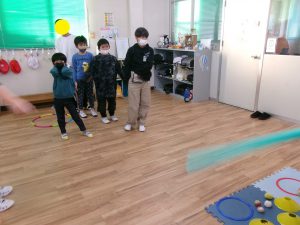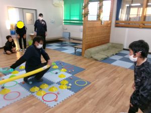 最初は同じペースで、2回目は不規則に動くプールスティックに当たらないよう、タイミングを見る子どもたち。