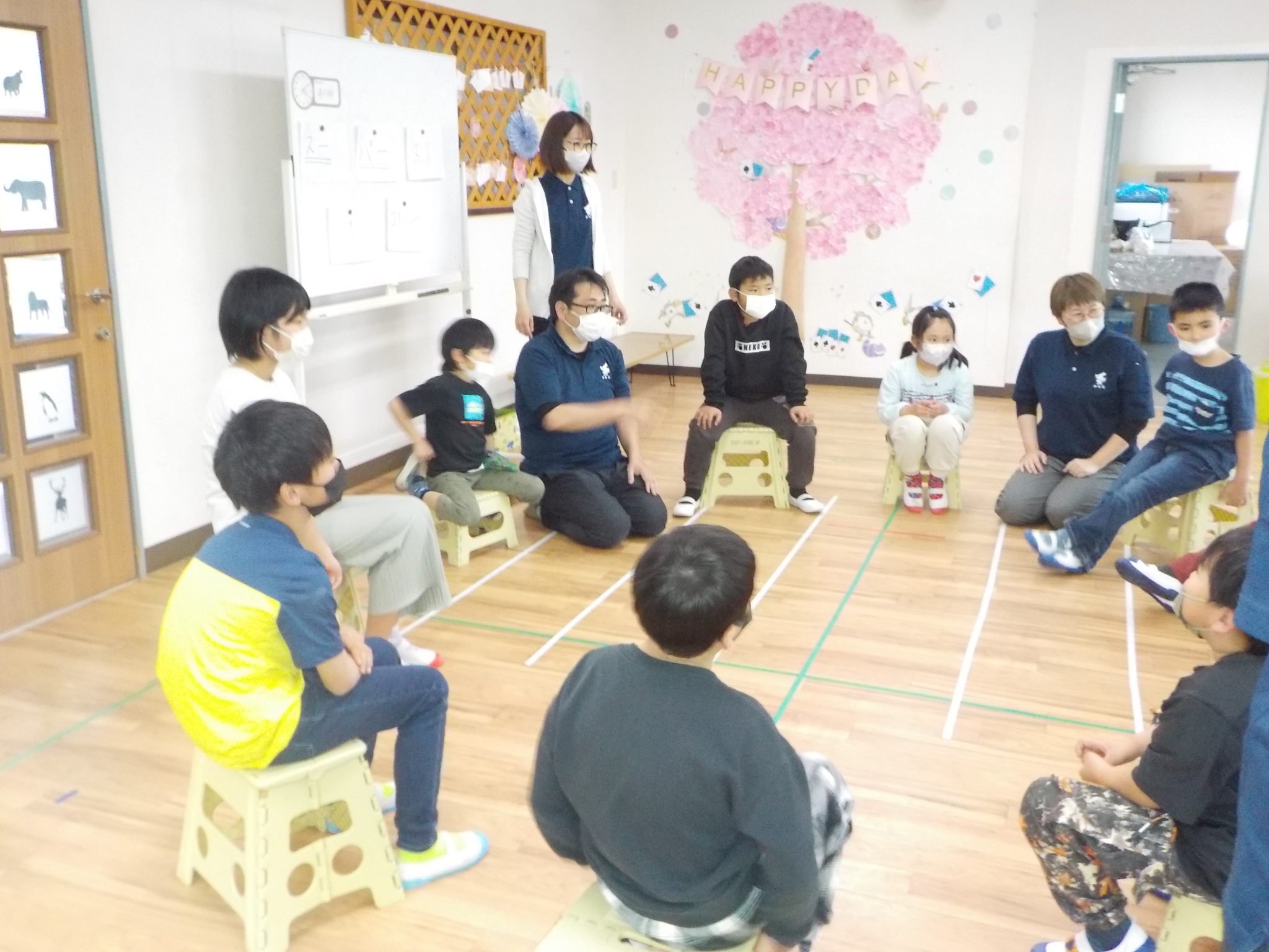 始めに「スーパーマリオゲーム」を行いました。順番に「スー」「パー」「マリ」「オ」と言っていき、最後は「コイ~ン」と言いながら両手を上に挙げます。週数が増えるにつれて、コイ~ンの数が増えていきます。他の児童の言葉を聞き、回数を覚えておかなければいけないのでワーキングメモリーにも繋がります。「コイ~ン」の数を覚えておくのが難しかったようで、職員が時折、サポートしながら進めていきました。