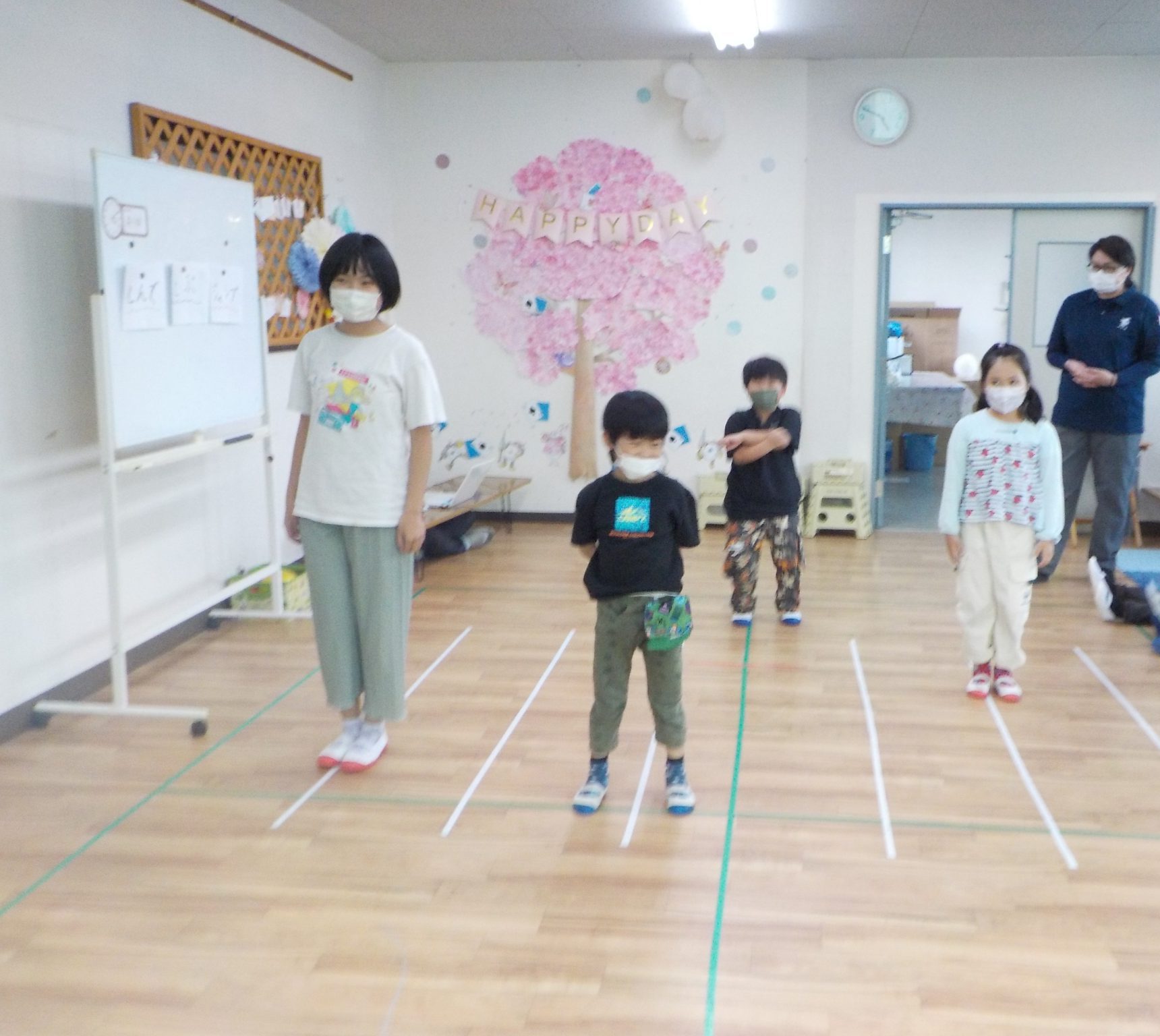 「とんぼ」などの言葉も交え、違う言葉の時にジャンプしてしまったら、スタートに戻ってもらいました。みんな集中して職員の言葉を聞いていましたが・・・「跳んでください。」などの引っかけ言葉には間違えてジャンプしてしまう児童もいました。