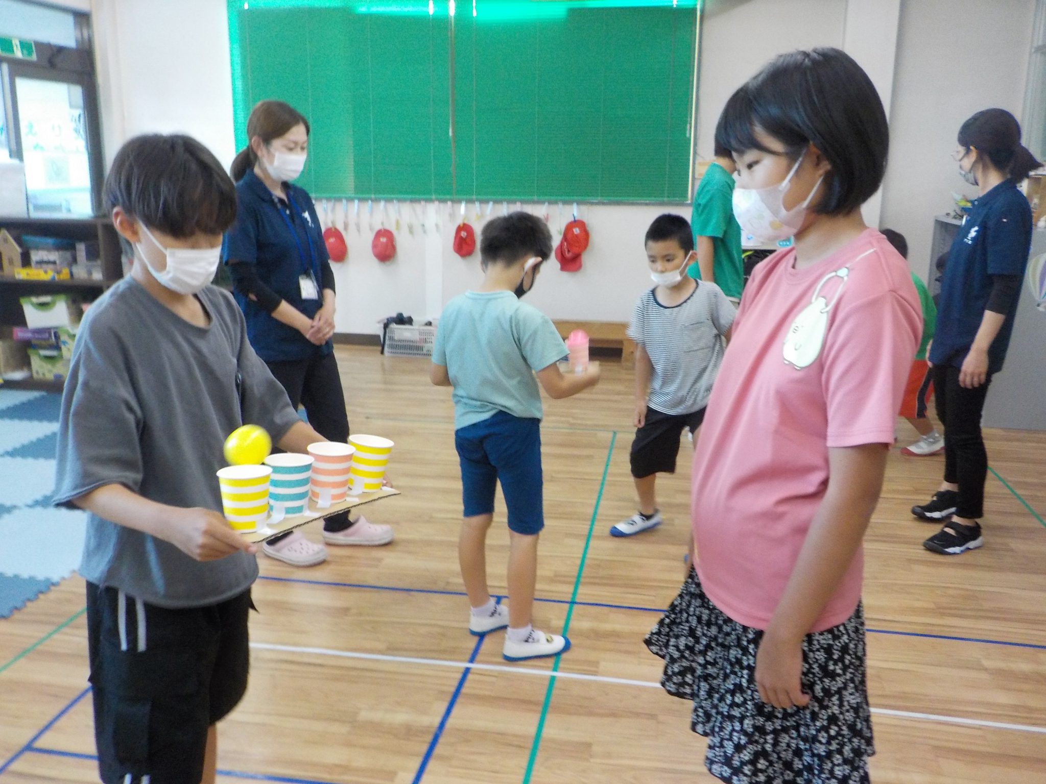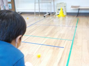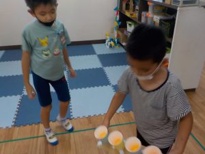 9月13日㈮、「ビジョントレーニング」では、4つの紙コップの中に、順番にピンポンボールを入れていくこと、