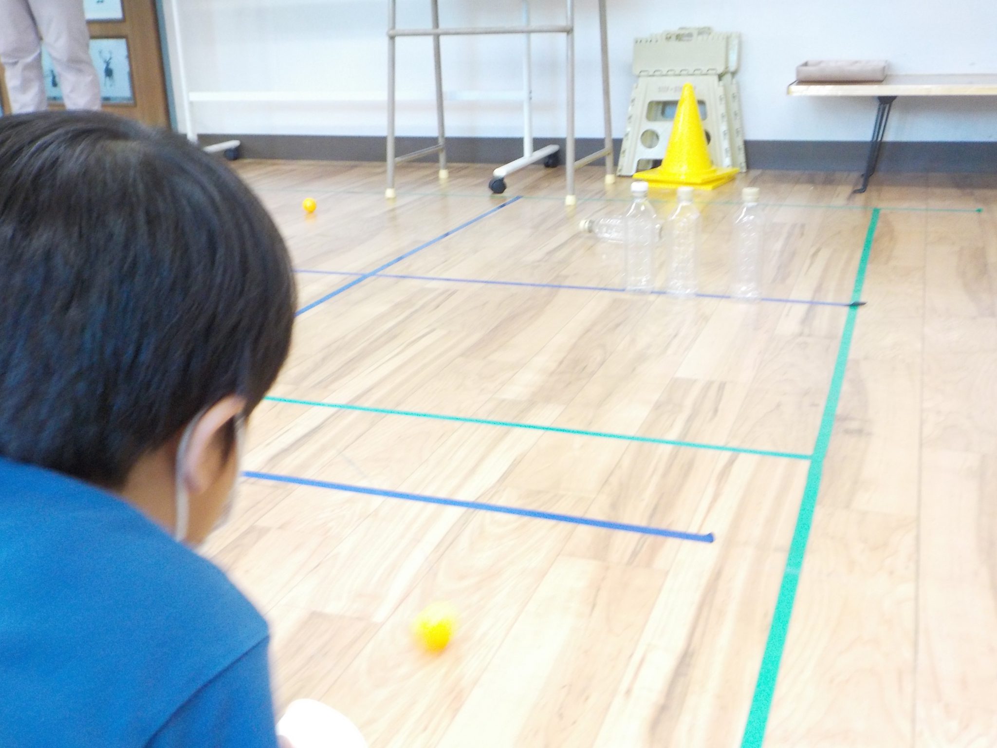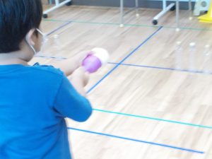 最後は、風船の中に、紙コップを入れて、空のペットボトルで的当てをしました。風船を紙コップに入れての飛ばしが意外と勢いが強く、