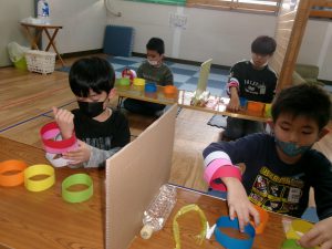 1月20日(火)の活動は、ワーキングメモリーの活動をしました。「見て、覚えて、順番に並べる」をしています。職員が7色の輪っかから、いくつか選んで一個づつ腕に通してから隠し、それを見ていた子ども達には、同じように自分の腕に通してもらいました。子ども達も見ていないといけないので、集中して取り組んでいたので、間違える事なく出来ていました。