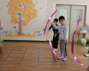 感覚を掴むのが難しく苦戦する様子が見られましたが、体や周囲にテープが付かないように集中して取り組む事ができました。