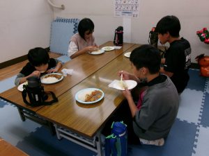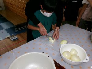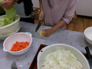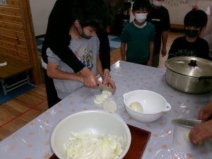 子ども達には、カレーに入れる、にんじん・じゃがいも・たまねぎを切ってもらい、包丁を初めて使う子が数人いたので、職員が後ろから手を回して補助をしながら、怪我をしないように慎重に切っていました。